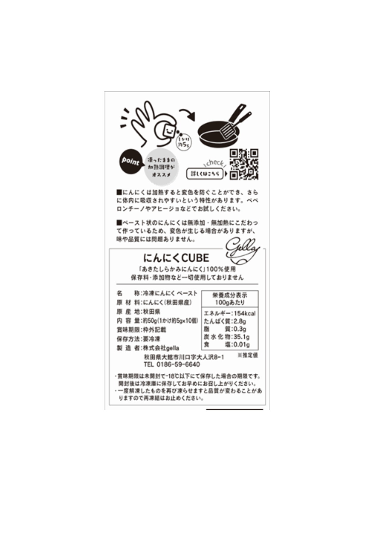 秋田県産の『白玉王』を使用した冷凍ペーストにんにくCUBE。手間いらずの使いたい分を「わるだけ」で、凍ったまま調理に使用できます。保存料・防腐剤は一切不使用なので、安心してお使いいただけます。家庭用はもちろん、業務用としても重宝する一品です!